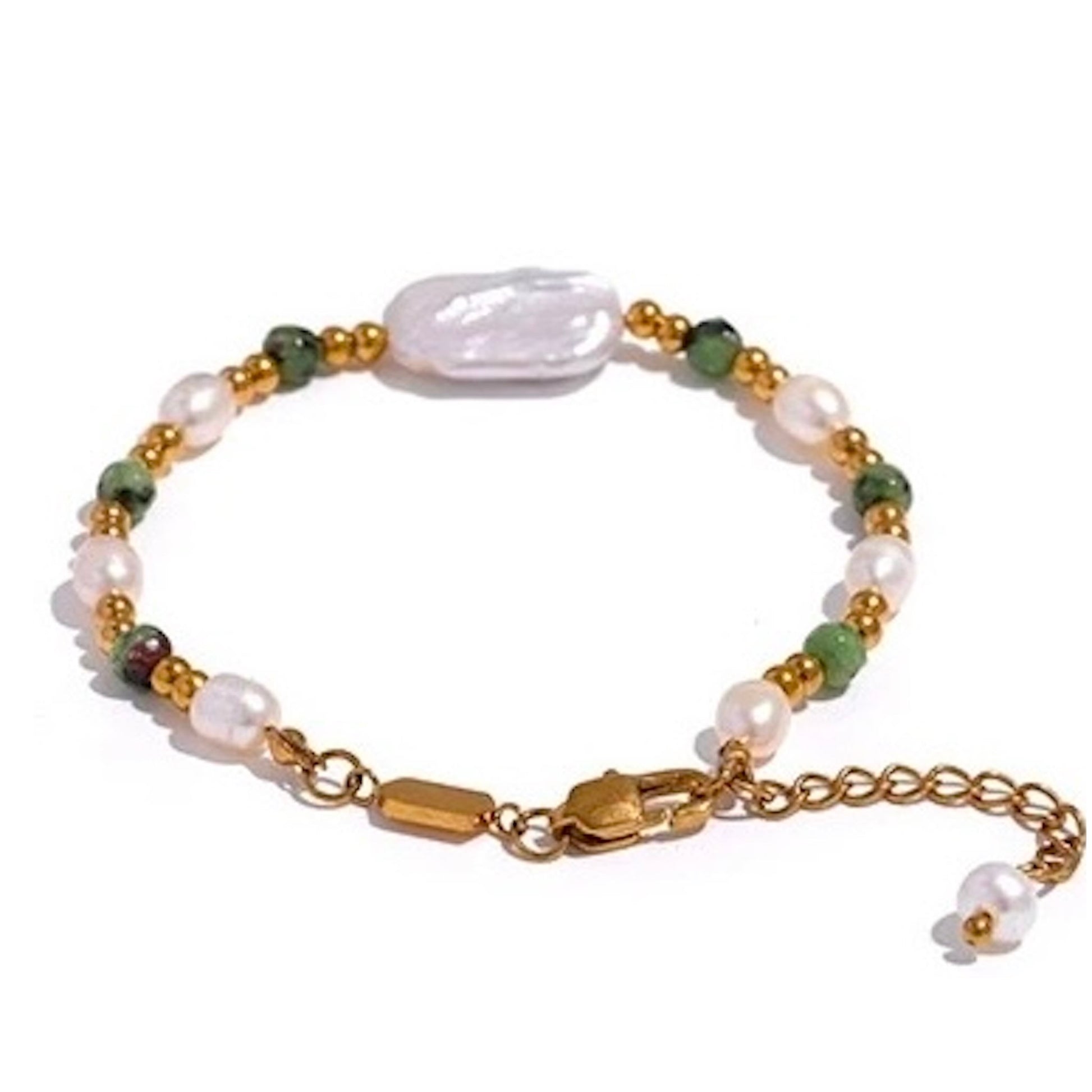 Ce bracelet raffiné marie l’élégance intemporelle des perles à la modernité des détails dorés pour un résultat lumineux et délicat. Il est composé d’une alternance harmonieuse de perles blanches baroques, de petites perles dorées lisses et de perles minérales vertes, offrant un jeu de couleurs subtil et naturel. En son centre, une perle baroque rectangulaire, à la forme irrégulière et à la nacre éclatante, attire le regard et confère au bijou tout son caractère.