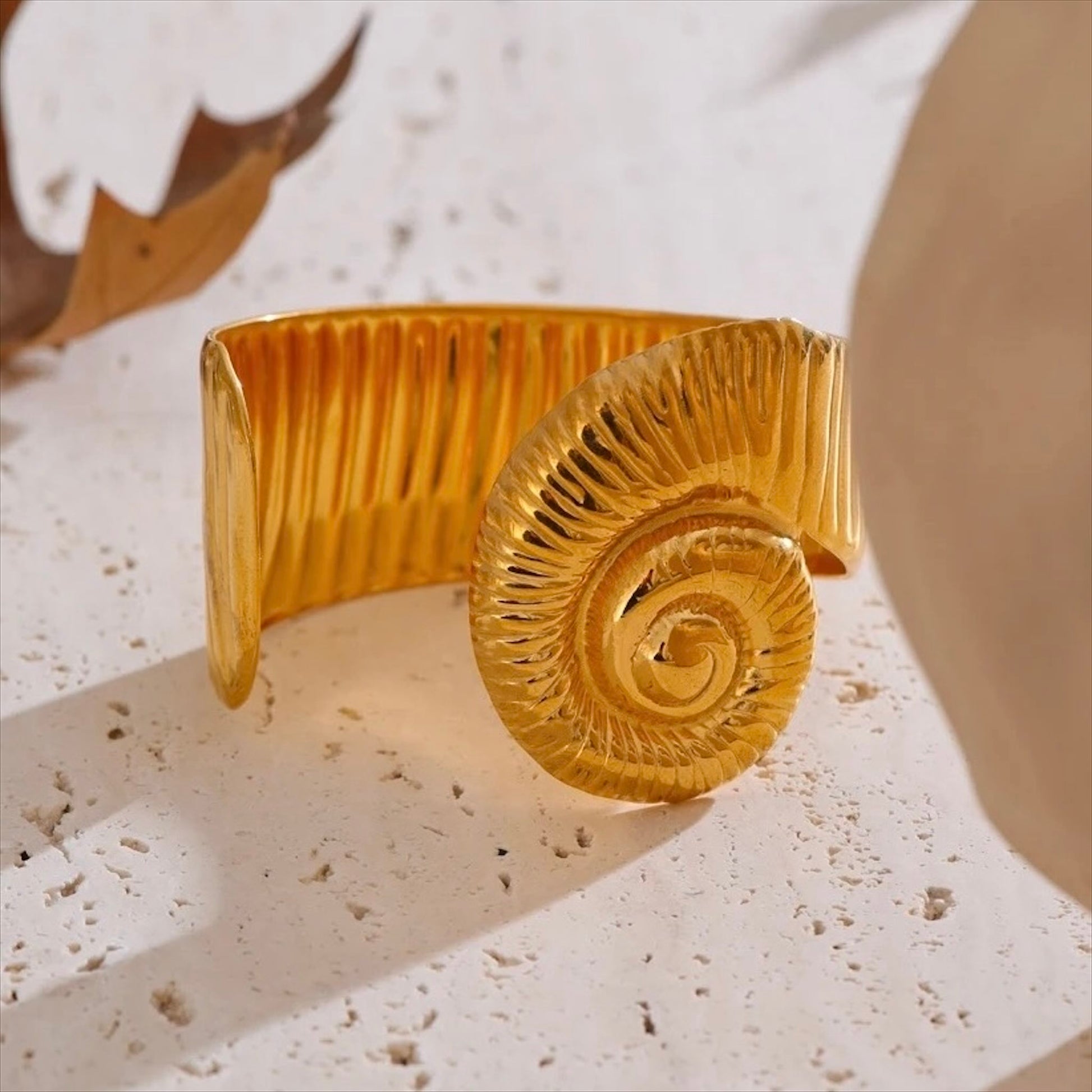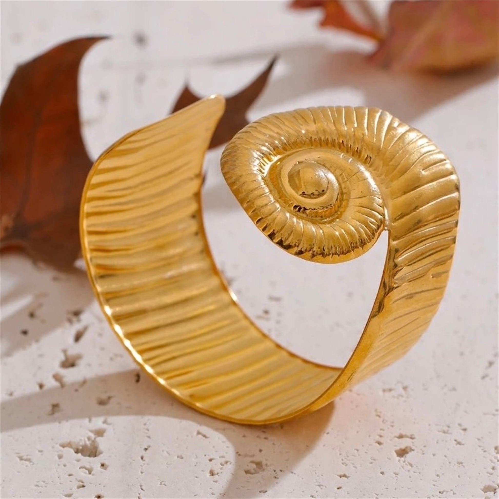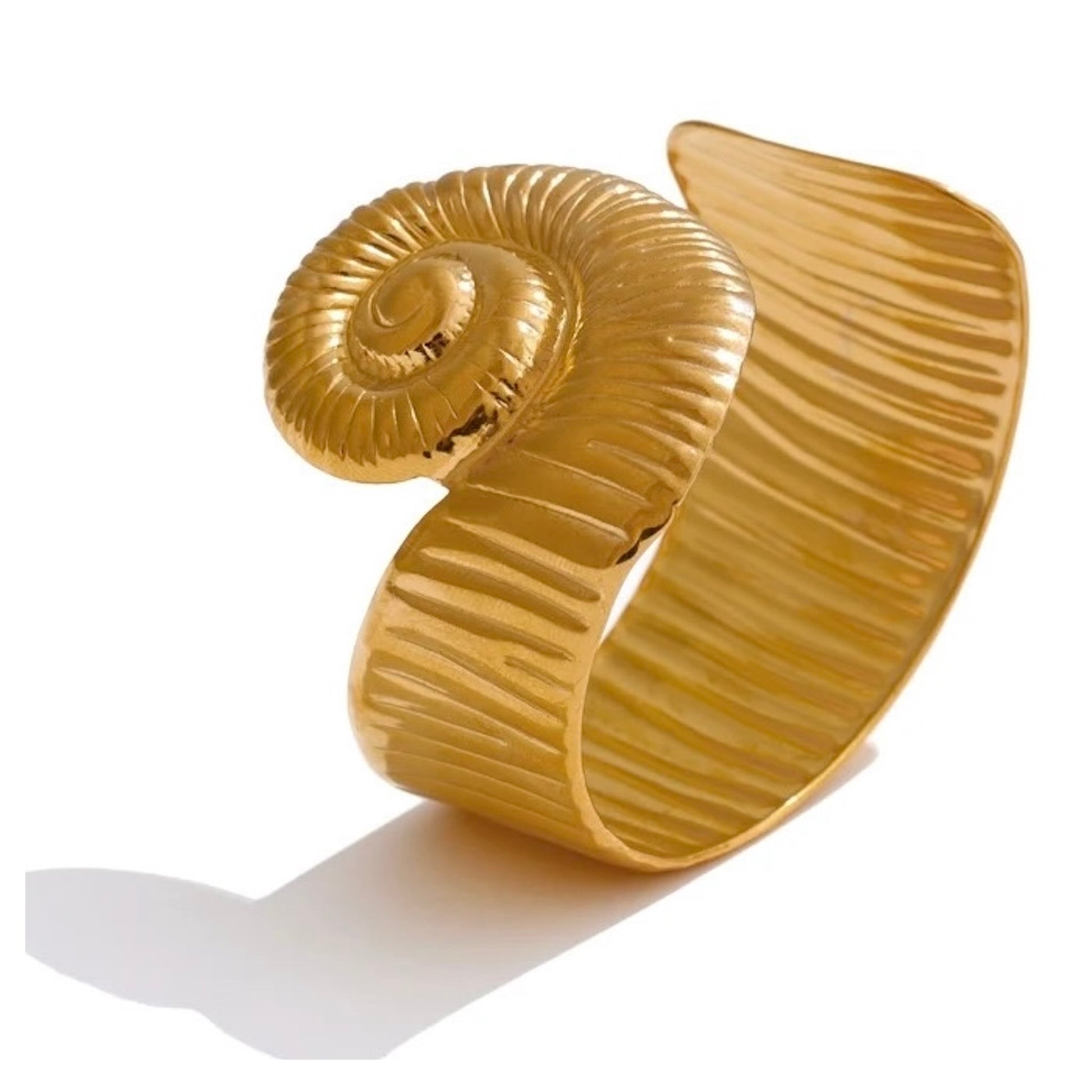 Découvrez ce bracelet manchette doré en acier inoxydable à l’allure sculpturale, inspiré par la beauté naturelle des coquillages fossiles. Sa forme originale et ses finitions texturées en font une pièce de caractère, idéale pour sublimer votre poignet avec élégance et audace.