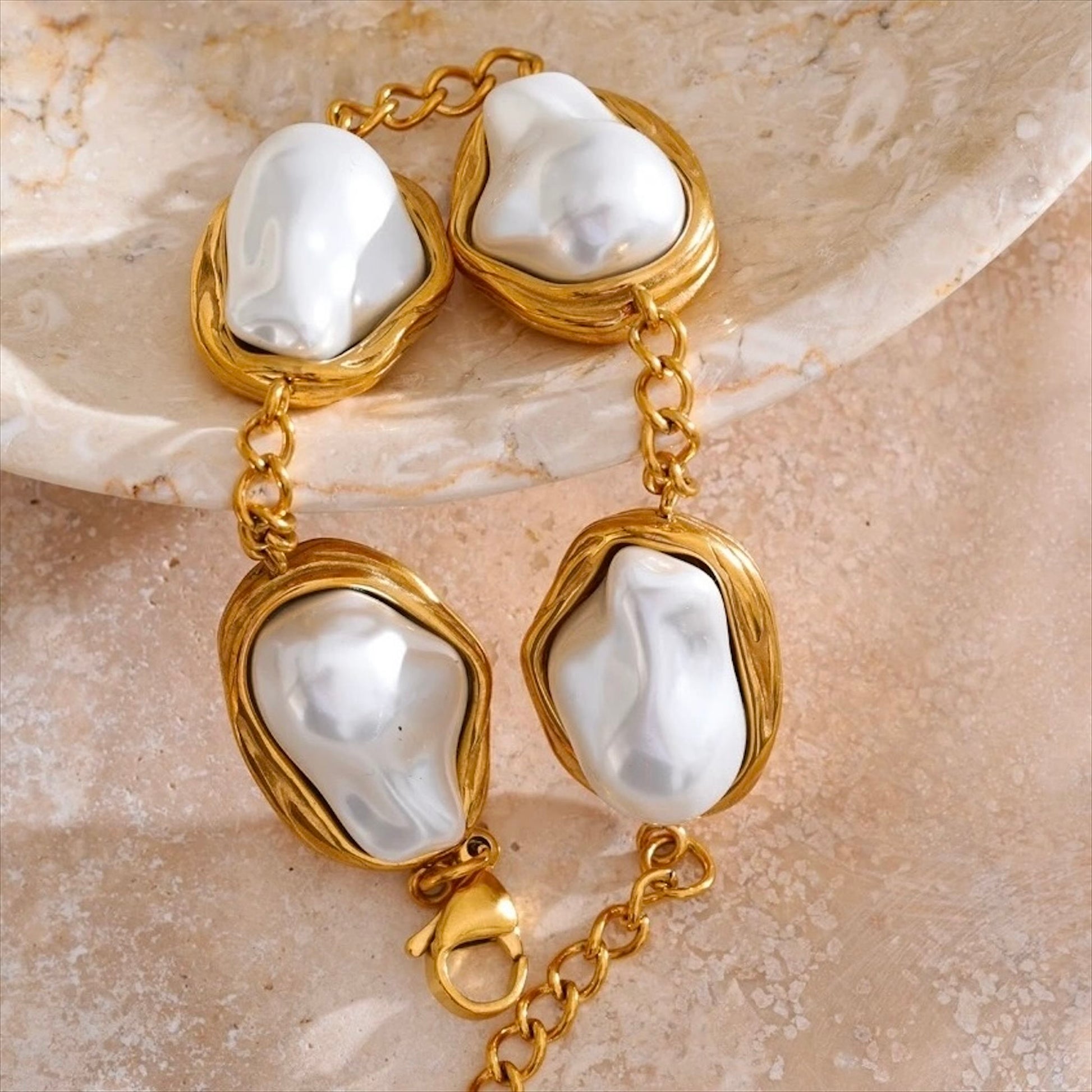 Élégant et intemporel, ce bracelet doré met à l’honneur la beauté naturelle des perles baroques. Il se compose de quatre perles blanches de forme irrégulière, chacune sertie dans un écrin de métal doré qui sublime leur éclat nacré. Les perles, toutes uniques par leur forme organique, apportent une touche d’authenticité et de raffinement à ce bijou.