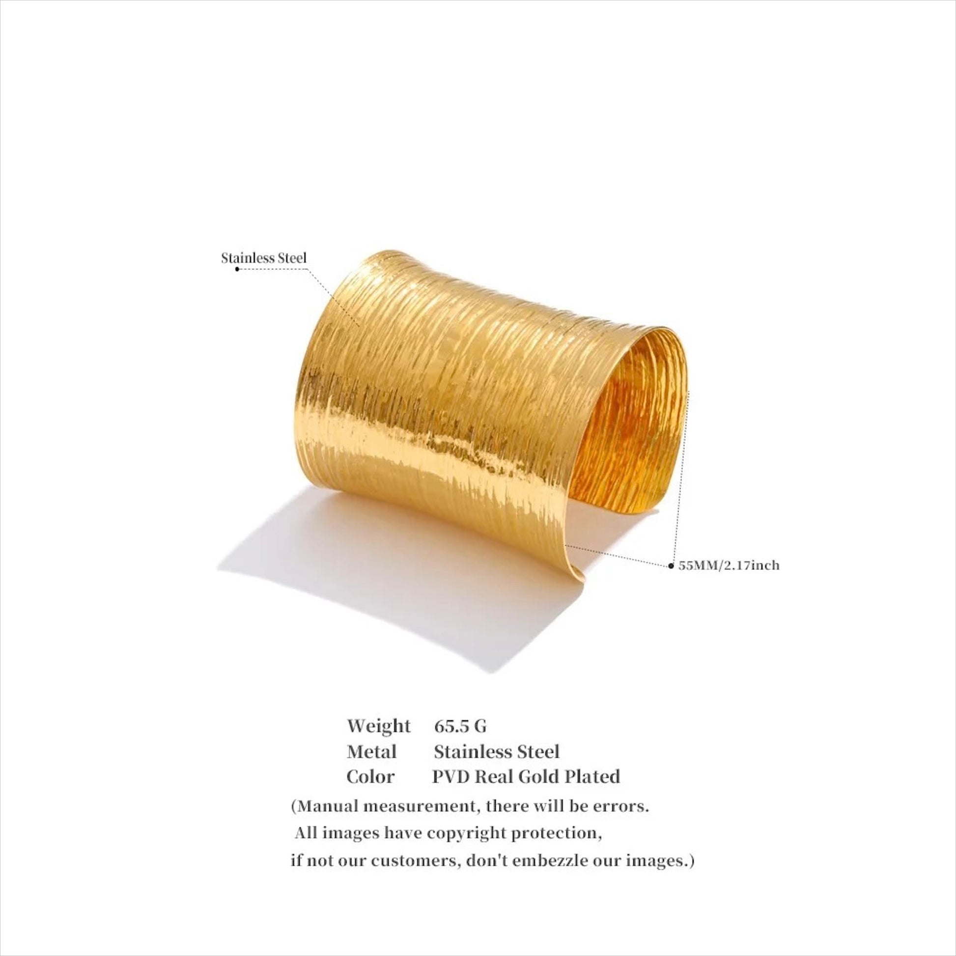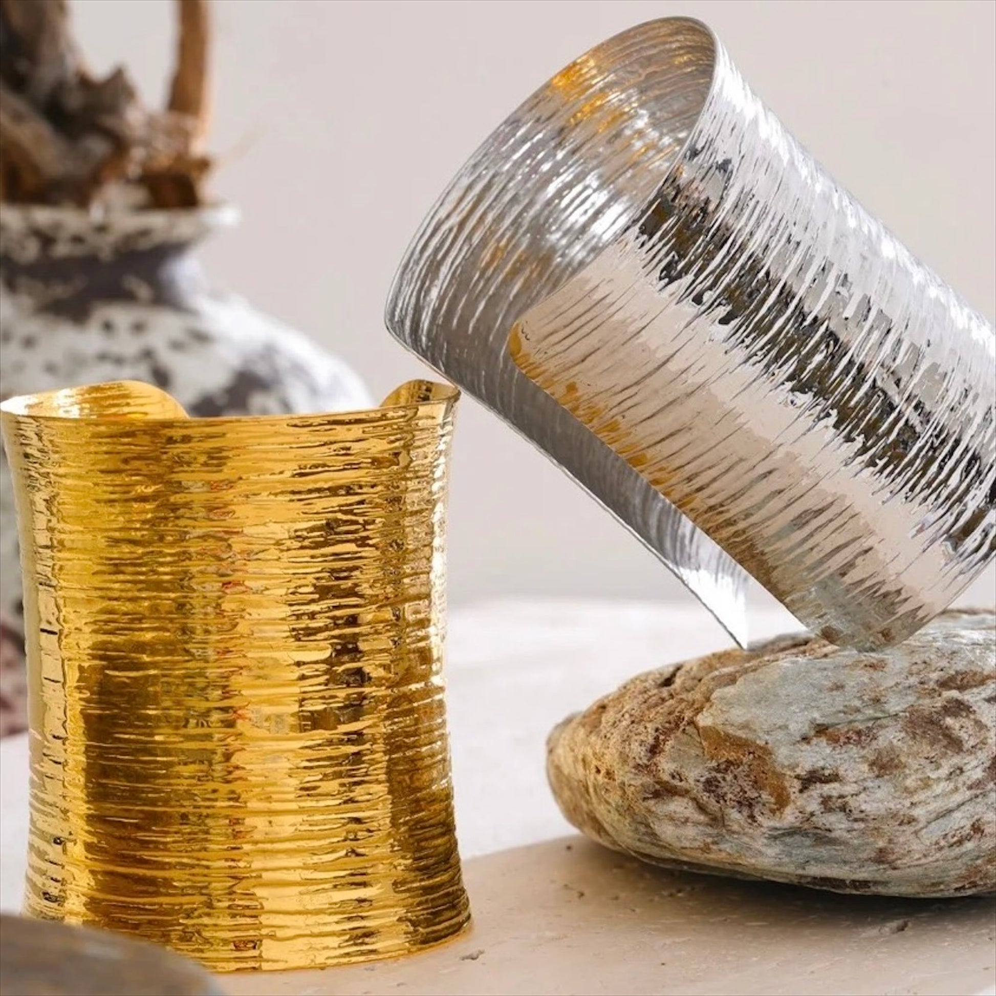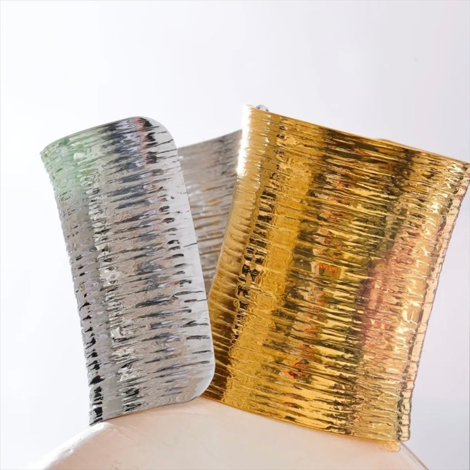 - Manchette extra large avec effet martelé, apportant texture et reflets uniques à chaque mouvement.
