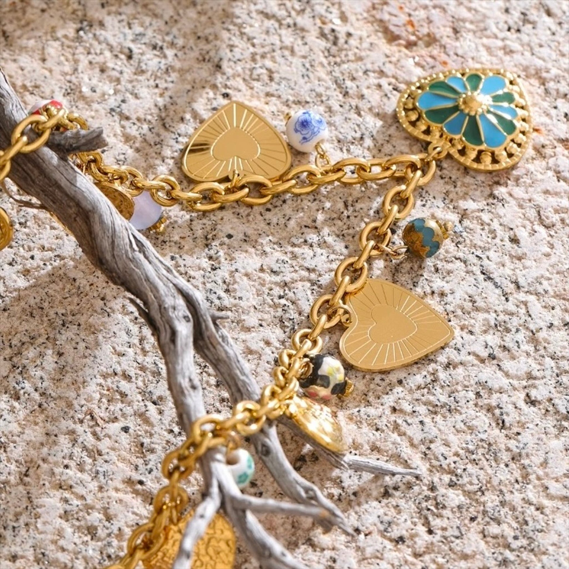 - Pendentif central en forme de cœur émaillé, orné d’un motif floral turquoise et doré pour une touche unique.