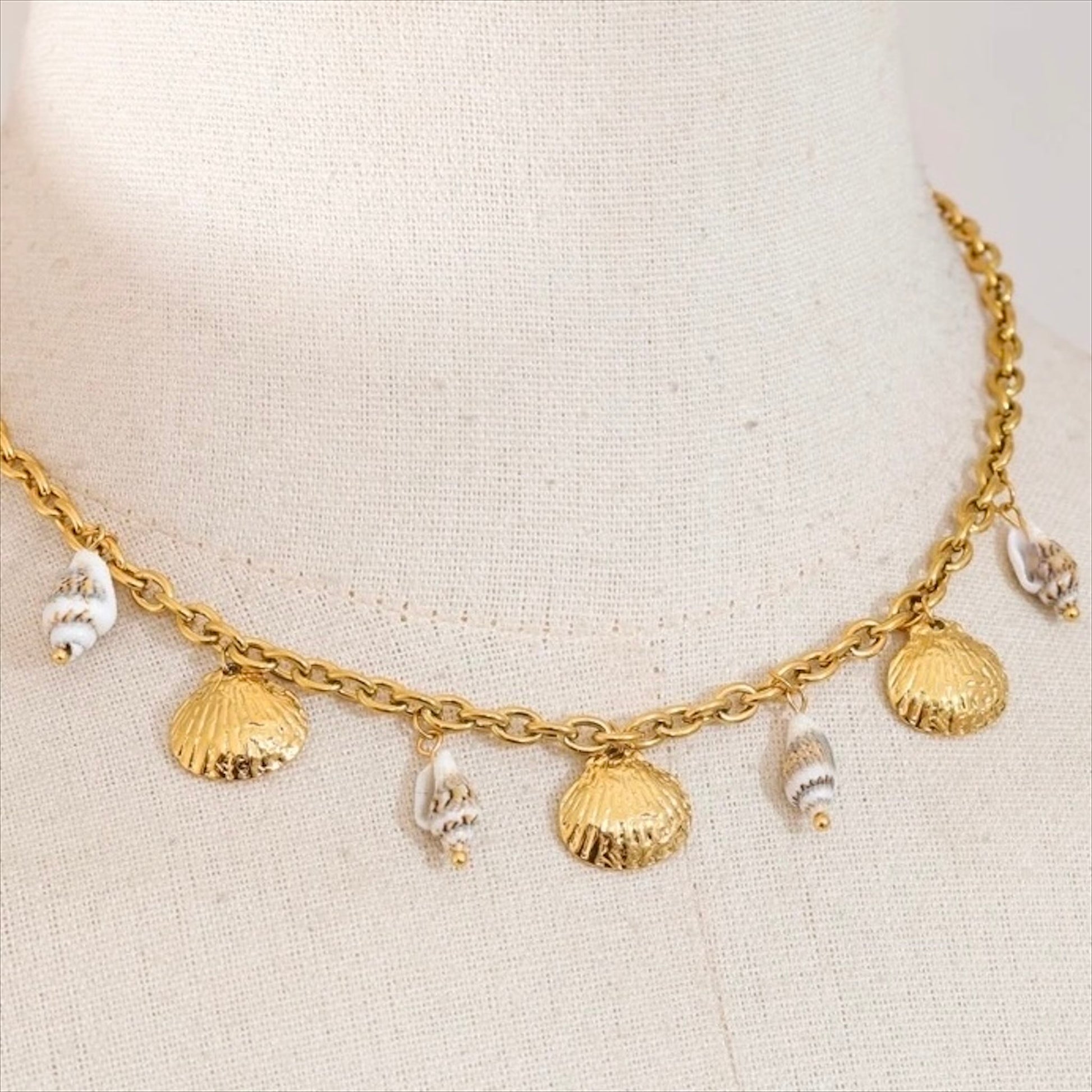 - Matériaux : Chaîne en or plaqué 18k, ornée de trois pendentifs en forme de coquillages martelées en or plaqué 18k et de quatre coquillages naturels.