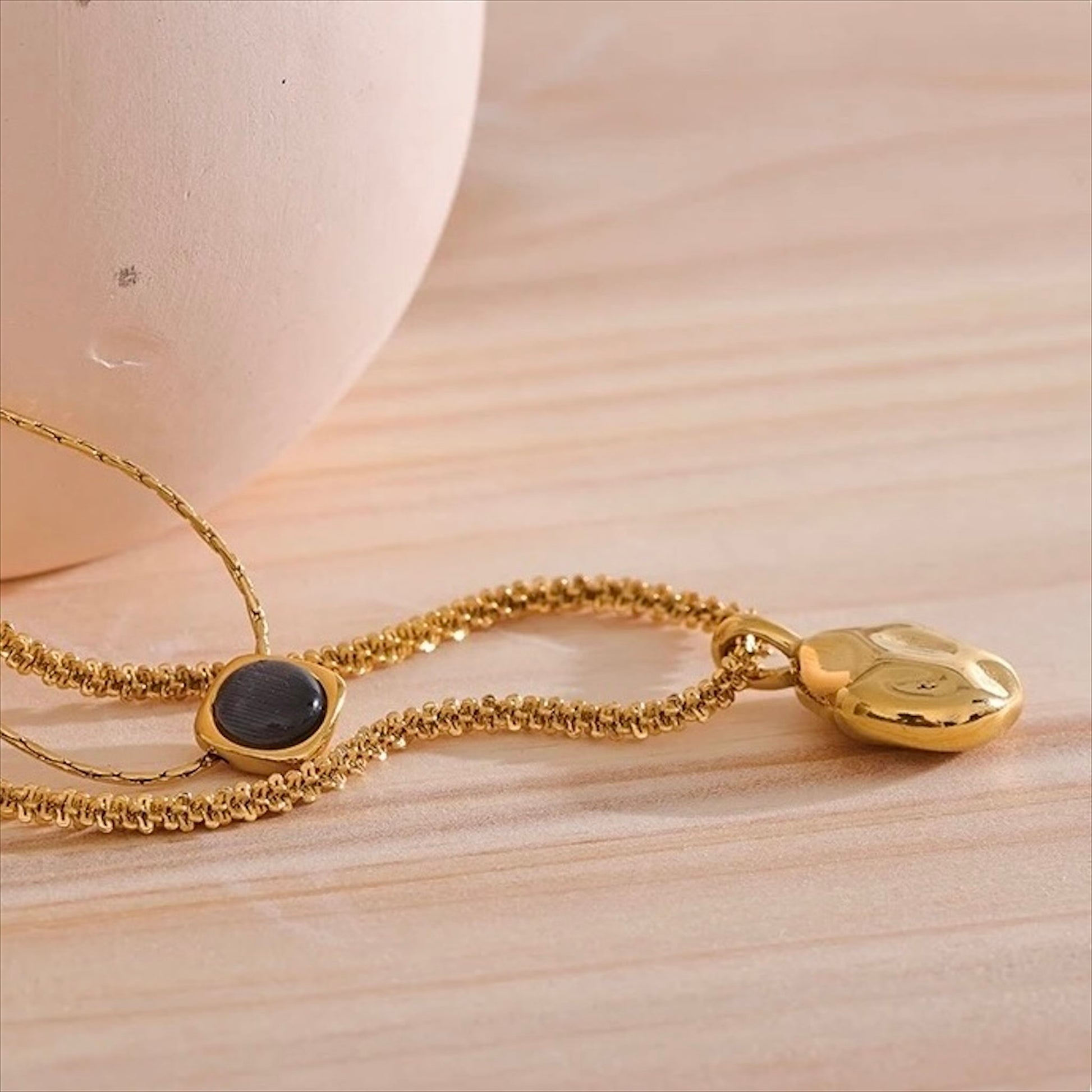- Deux chaînes dorées : la première, plus courte, est ornée d’un pendentif carré serti d’une pierre sombre à l’éclat mystérieux, apportant une touche de raffinement et de contraste.